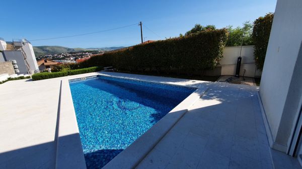 Ta oferta to nowoczesna willa o ciekawym designie z basenem i widokiem na morze na wyspie Ciovo (z połączeniem mostowym z lądem) w Dalmacji.