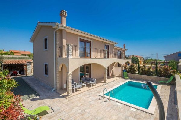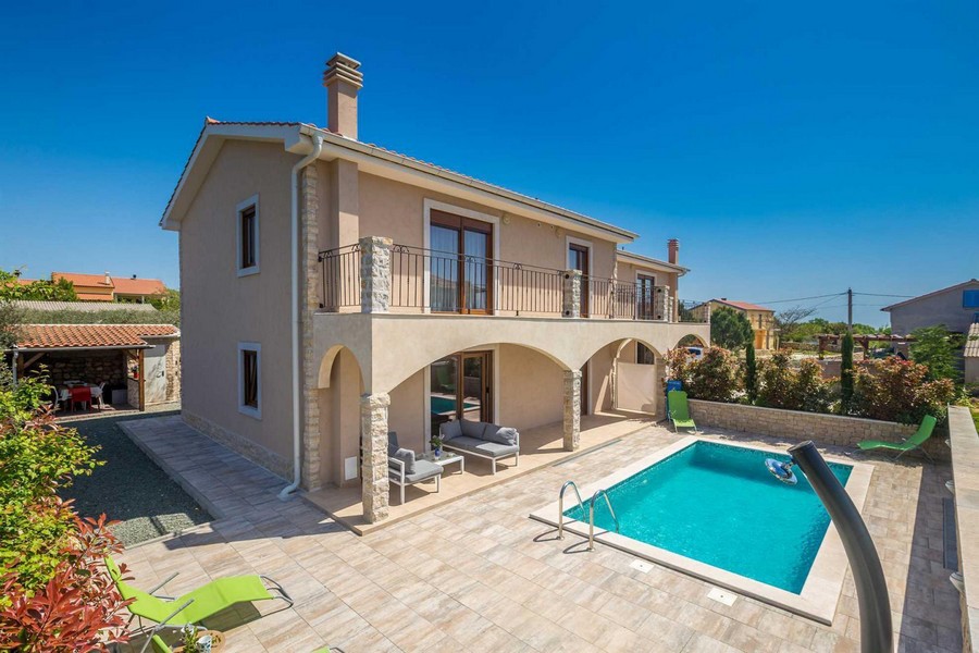 Dom został wybudowany w 2015 roku na działce o powierzchni 859 m² w spokojnej wiosce w regionie Krk. oferuje łączną powierzchnię ok. 400 m². Obydwa domy bliźniacze mają następujący rozkład pomieszczeń na dwóch piętrach: